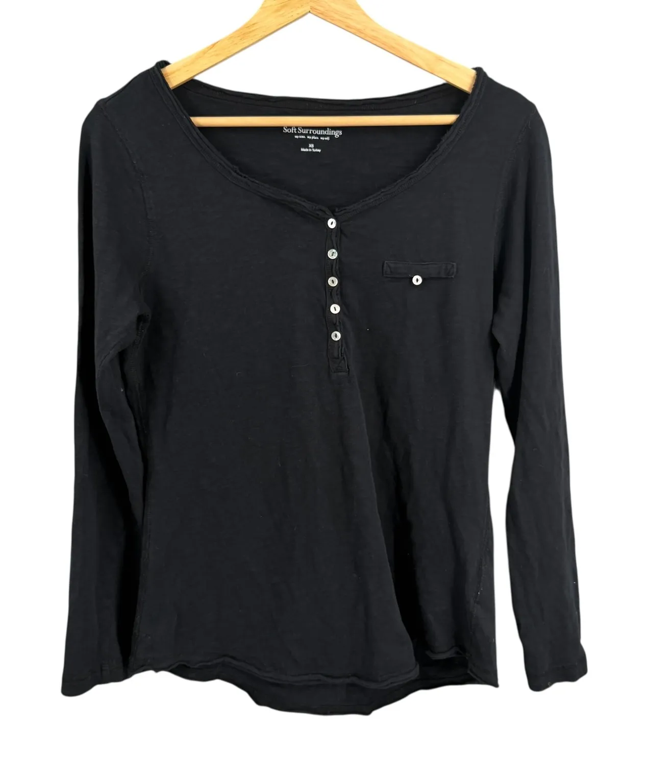 Soft Surroundings Black Cotton Henley Top – XS Soft and breathable 100% cotton Henley from Soft Surroundings. Features a button front placket, small chest pocket, and relaxed fit. Perfect for casual or loungewear. Details: - Color: Black - Material: 100% Cotton - Armpit to Armpit: 18" - Length: 24" - Sleeve Length: 23" Excellent pre-owned condition. Classic, soft, and versatile. Keywords: soft surroundings, henley, long sleeve, pocket tee, basic, casual, everyday, comfortable, cotton, turkey made, womens top, button neck