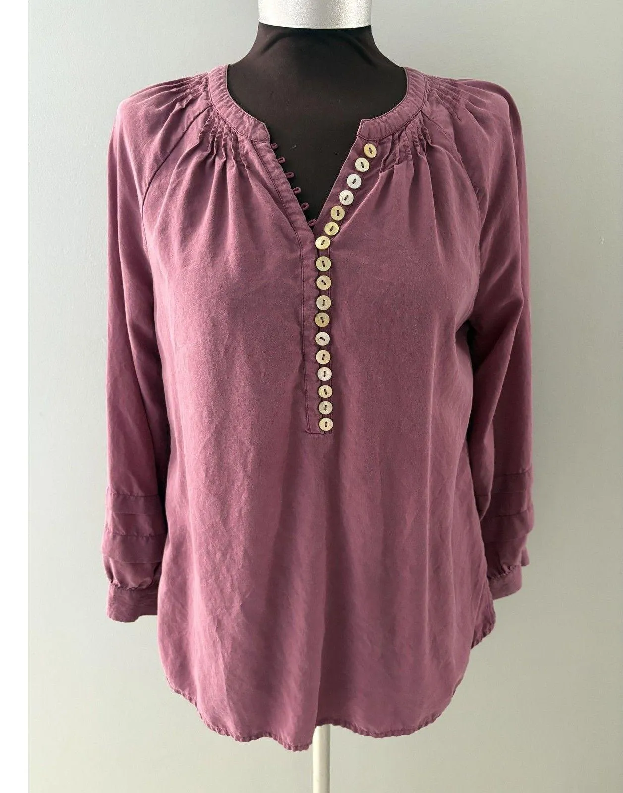 Measurements (inches) - laying flat Tag Size: S Length (top of collar to hem): 25" Chest (pit to pit): 19" Sleeves: 20" Waist: 19 1/2" Additional Information: Beautiful eggplant color, Silky feel, Lightweight Please check your measurements with the ones in the listing. Do NOT rely on Tag Size.