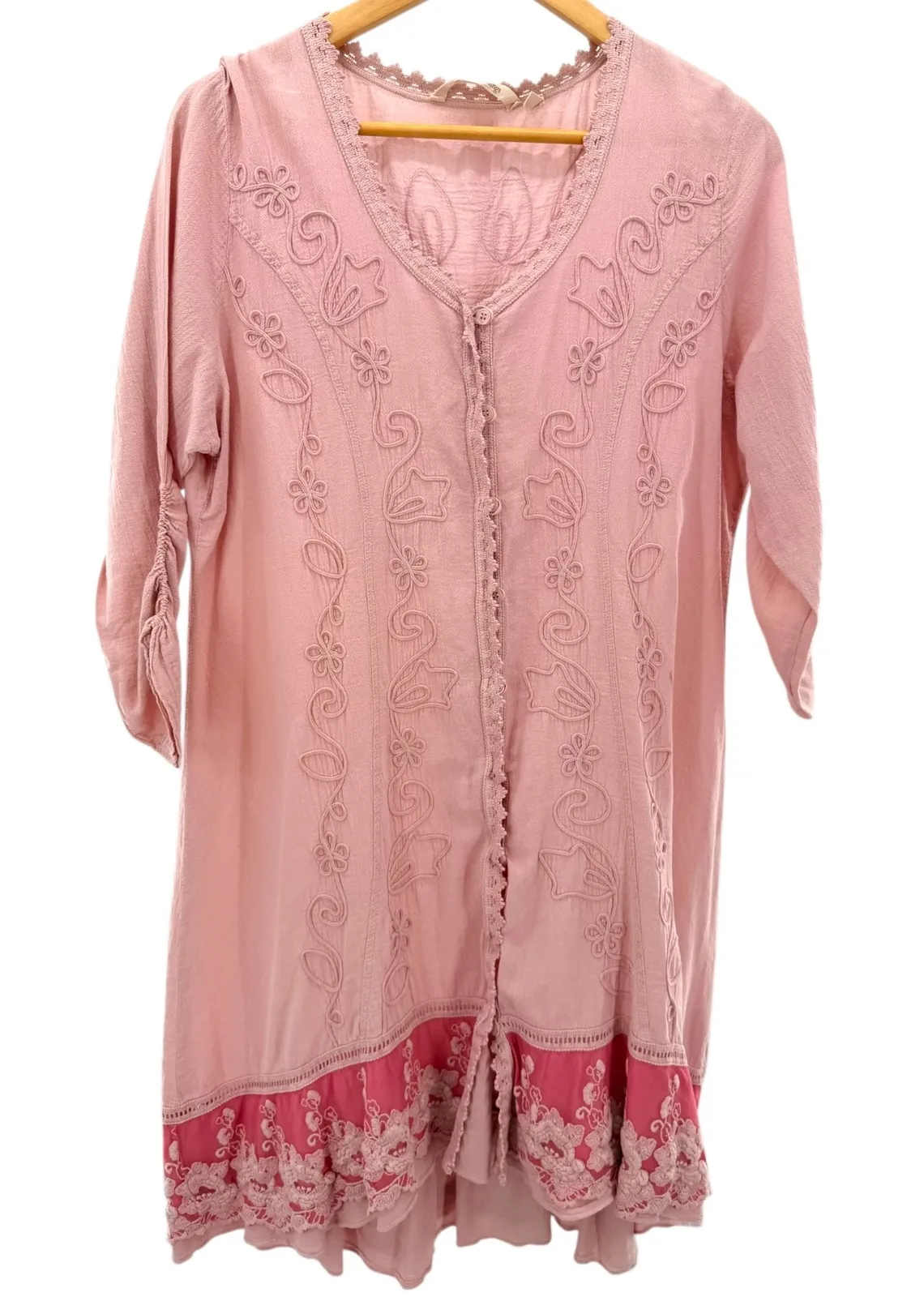 A Soft Surroundings pink embroidered tunic top. This charming piece showcases intricate floral embroidery along the front, a flattering V-neckline with delicate crochet trim, and a button-front closure. The sleeves feature adjustable ruched detailing for a customizable fit, and the hem is adorned with a contrasting pink fabric and lace trim. Perfect for a casual daytime outing or a relaxed vacation look. Measurements Length 40" Pit to Pit 22" Sleeves 21" Type: Blouse Department: Women Style: Tunic Material: 100% Cotton, Cotton, Nylon Neckline: V-Neck Sleeve Length: 3/4 Sleeve Sleeve Type: Roll Tab Sleeve Pattern: Floral Accents: Embroidered, Button Theme: Peasant Features: Unlined Fit: Relaxed Fabric Type: Woven Occasion: Casual, Travel Closure: Button Keywords: Soft Surroundings, pink tunic, embroidered top, boho, cottagecore, feminine, floral detail, crochet trim, ruched sleeves, button front, lightweight, casual wear, resort wear, travel clothing