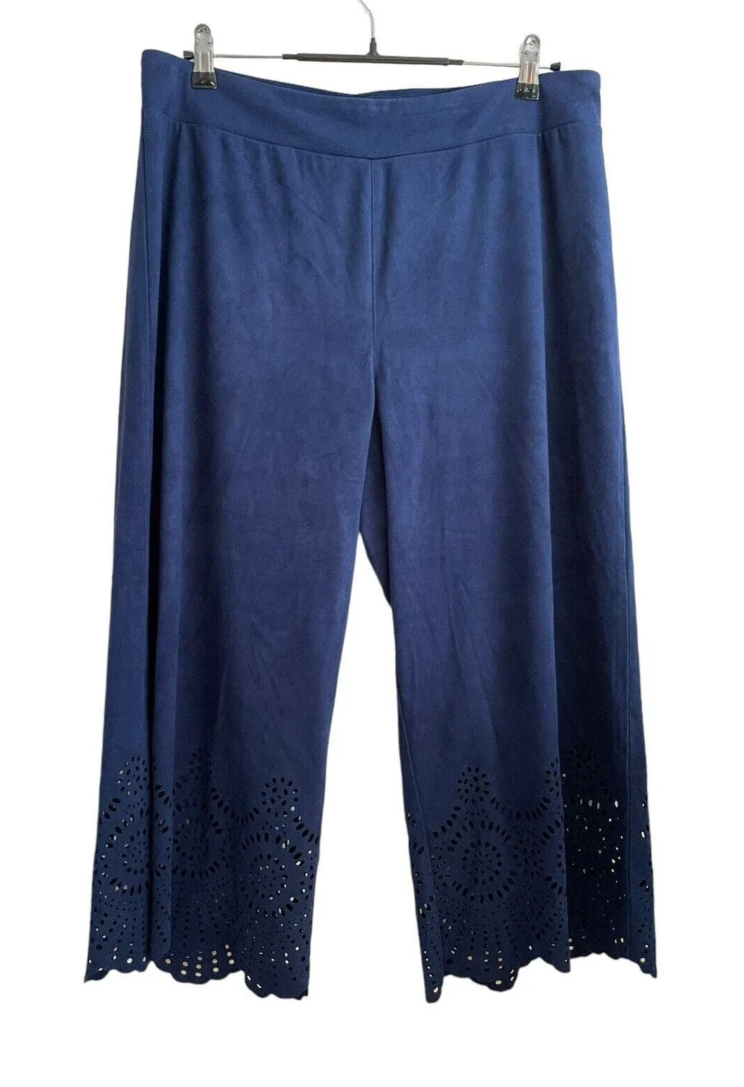 Gently pre-owned Soft Surroundings wide leg cropped pants in navy blue. Culotte style casual pants with eyelet laser cut details on hems with scallop edge. Faux suede material, very soft and comfortable, made of polyester and spandex. Pull on, no pockets, elastic waist. High waist. Boho, casual, comfort, beach, resort, vacation, preppy, lounge. In good used condition. Size women large Waist laid flat 17" Hips laid flat 22" Rise 12" Inseam 21" Leg opening laid flat 11" Measurements are approximate.