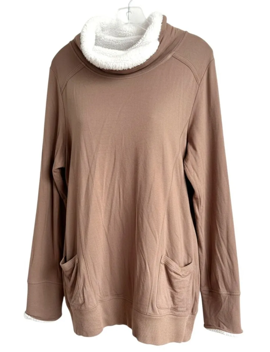Soft Surroundings Forrester cozy cowl neck top in a versatile brown taupe color. This long sleeve top features a plush sherpa lining in the cowl neck for ultimate comfort and warmth. Two convenient front pockets add functionality, and the relaxed fit makes it perfect for everyday wear. Ideal for casual outings, lounging at home, or weekend getaways. Style: Tunic Department: Women Material: Polyester, Rayon, Spandex Neckline: Cowl Neck Sleeve Length: Long Sleeve Type: Sweater Features: Pockets, Lined Pattern: Solid Fabric Type: Fleece Accents: Fur Trim Season: Fall, Winter Fit: Relaxed Occasion: Casual, Travel Garment Care: Machine Washable Country of Origin: China Women's Plus Size 1X PIt to pit - 24" Length - 32" Keywords: soft surroundings, cowl neck, sherpa lined, taupe, long sleeve, pockets, cozy, loungewear, pullover, casual, winter, athleisure, oversized fit