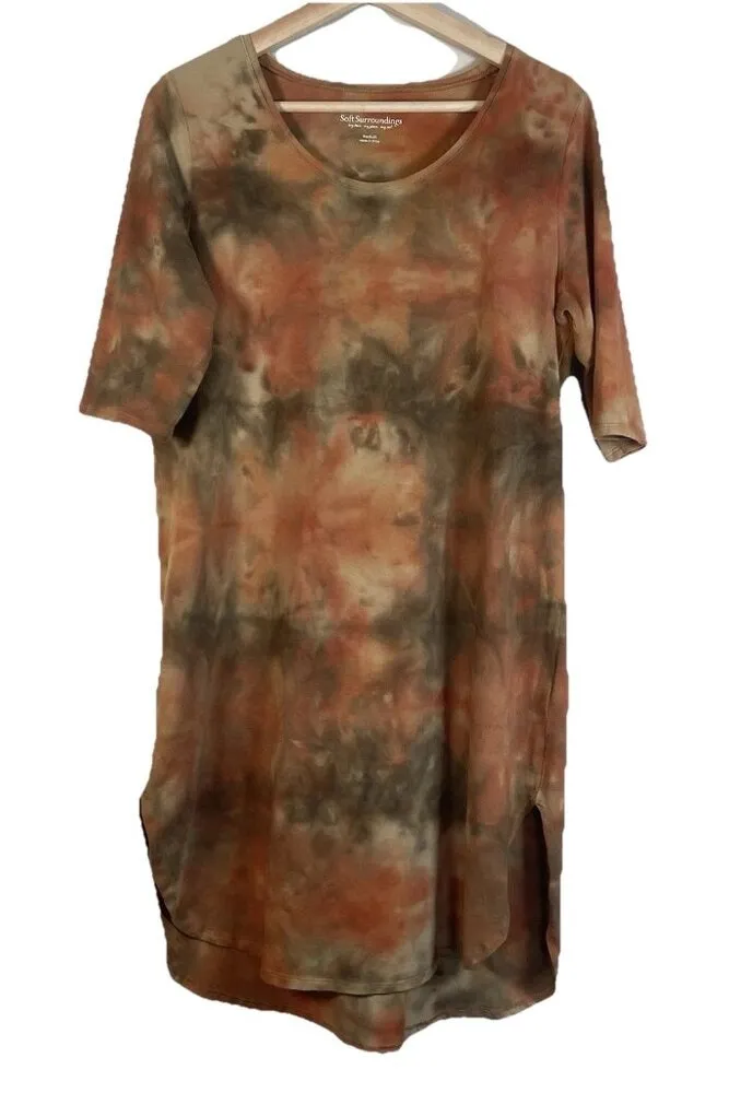 The Soft Surroundings Mini Dress Tunic Top in size M for women features a vibrant orange and brown tie-dye design, perfect for fall. Made from a comfortable cotton blend jersey fabric, this top has a stylish boat neckline, half sleeves, and a pullover closure for easy wear. Ideal for travel or casual occasions, the tunic top showcases a colorful and bohemian theme, making it a versatile addition to your wardrobe for the summer, fall, and spring seasons. Fall, Halloween, Pumpkin Patch, Bohemian, Hippie, Halloween