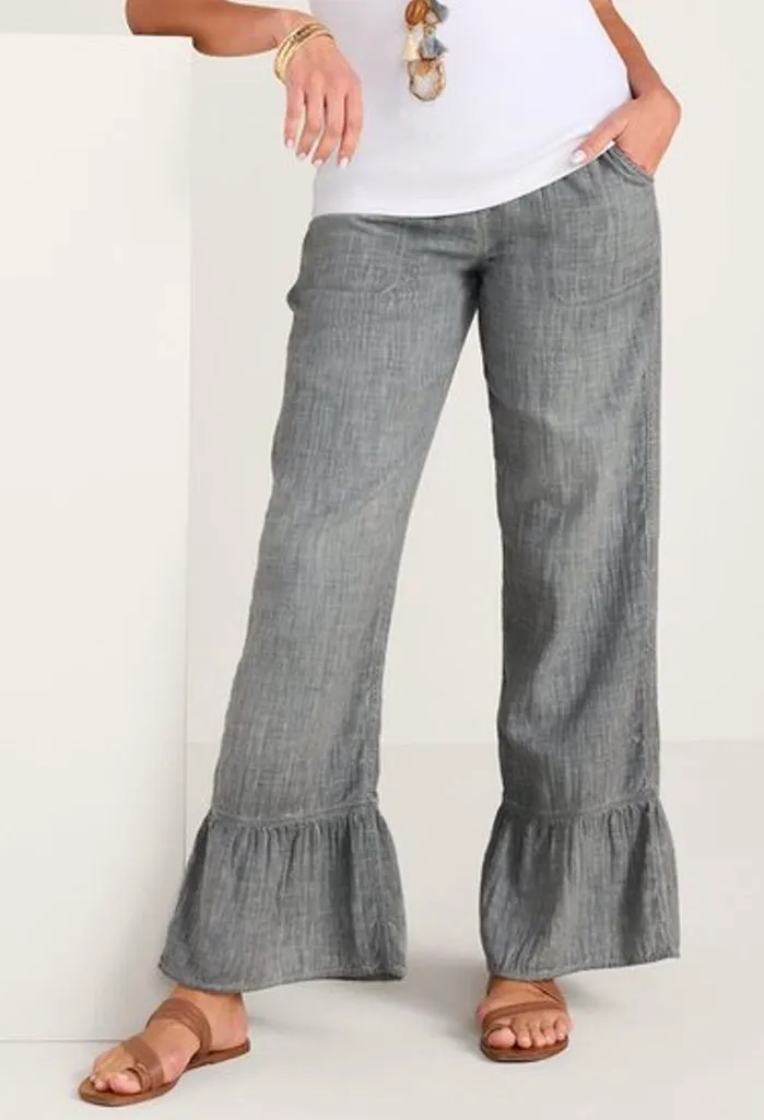 Soft Surroundings Petite Raleigh Gray Gauze Cotton Wide Leg Flounce Hem Pants M Finished with a flo... Show more