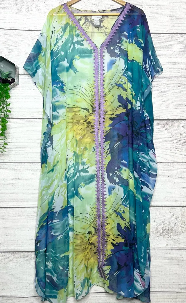 Soft Surroundings Sheer Floral Embroidered V-Neck Kaftan Dress One Size Fits Most No interior lining Sheer Flowy floral elegant tropical travel resort pool resortwear cruise beach island exotic luxurious sexy Stunning maxi dress with vibrant floral design. Features a mix of blue, green, and purple. Lightweight and stylish.