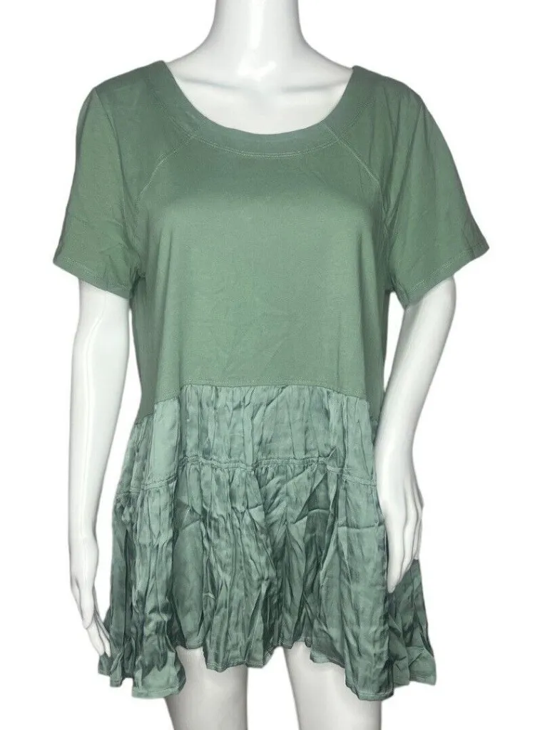 Soft Surroundings Shirt Women Large Sage Green Khole Top Mix Media Tiered Satin Women’s Size Large Short Sleeve Scoop Neck Jersey Top Satin Bottom Ruffle Lightweight Pullover Style 100% Cotton Measurements are Approximate: Length 29” Armpit to Armpit 21” Gently Used Condition. No Rips Tears or Stains (X2)
