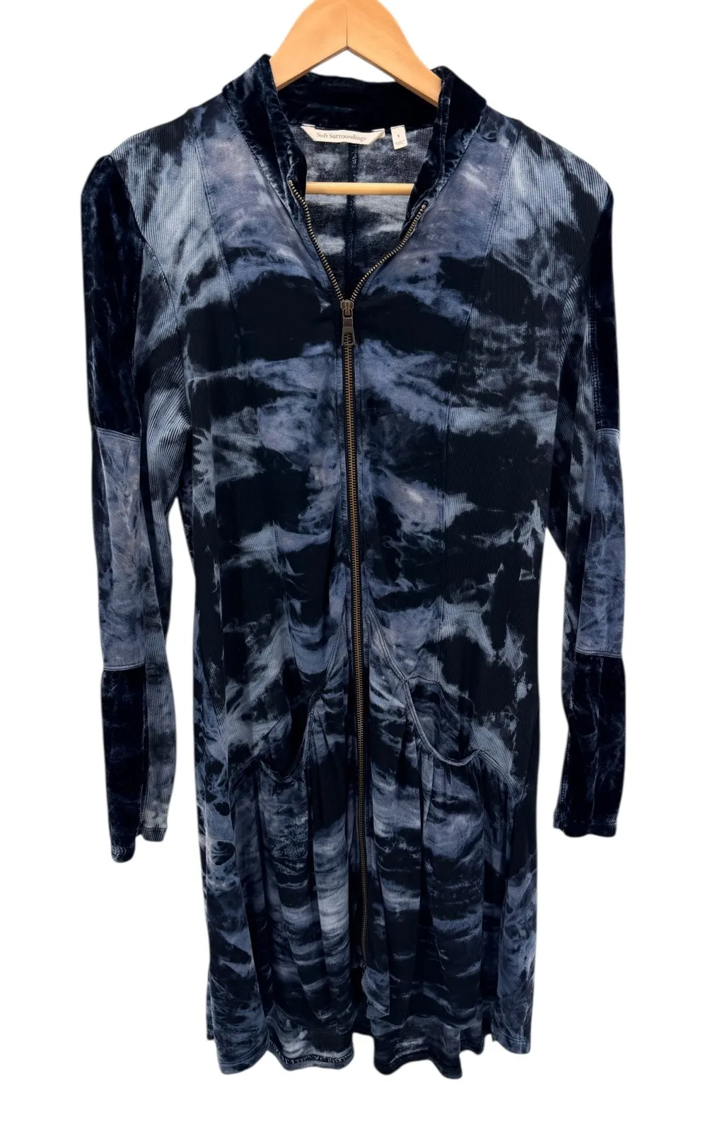 A Soft Surroundings tie-dye zip-up long sleeve dress with velvet trim. This piece features a unique tie-dye pattern in shades of black and blue, offering a striking visual appeal. The dress has a full zip front for easy wear and two front pockets for convenience. Contrasting velvet panels on the sleeves add a touch of luxurious texture. Perfect for a casual outing or a relaxed evening. Measurements (approx): • Bust: 40" • Length: 39" • Sleeve: 25" Style: Shirt Dress, Jacket Dress Dress Length: Midi Department: Women Sleeve Length: Long Sleeve Pattern: Tie Dye Occasion: Casual Fabric Type: Rayon Neckline: Collared Garment Care: Machine Washable Country of Origin: Vietnam Unit Type: Unit Keywords: Soft Surroundings, tie dye, velvet, zip up, long sleeve, dress, casual, boho, lounge, comfort, unique pattern, fall fashion, winter wear