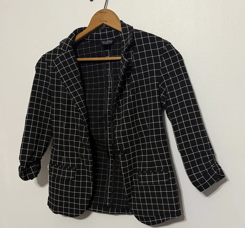 Chic blazer with a black and white grid pattern. Ideal for versatile styling. SoHo super soft and stretchy, black and white checkered plaid blazer Features scuffed sleeves and one singular button in the middle Super soft with material consisting of 46% polyester 38% rayon 12% nylon and 4% spandex This is such a versatile blazer and can be worn so many different ways to easily dress up an outfit PTP measuring at 17 inches with room for stretch Length measuring from top of shoulder to bottom of the blazer at 24.5 inches Location Q