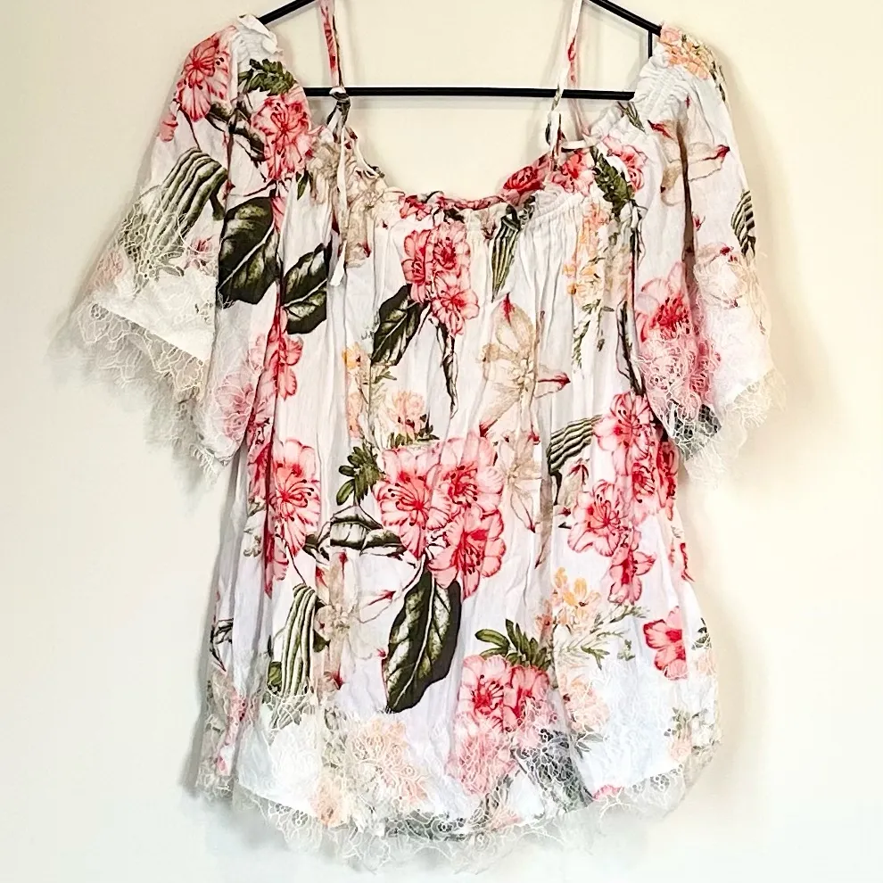 Soho Jeans New York & Company Floral Lace Off the Shoulder Blouse Size: Large Elegant blouse with floral design. Features lace trim and vibrant colors. Flowy off the shoulder sleeves with adjustable shoulder straps. Ideal for any occasion. C13