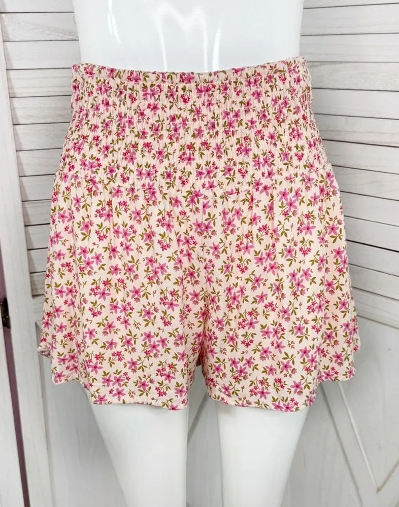 Soho Lady Floral Smocked High Waist Skort Shorts Pink Size Medium Peach pink with pink & green d... Show more