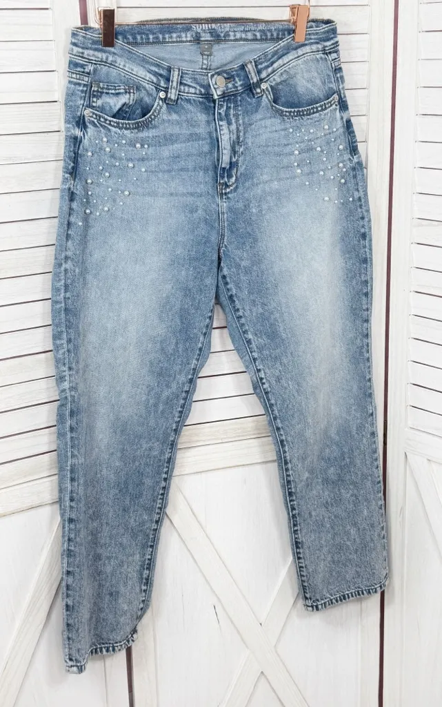 Soho Pearl Embellished Pockets Stone Washed High Waist Crop Jeans Blue Size 10 Stone washed medium... Show more