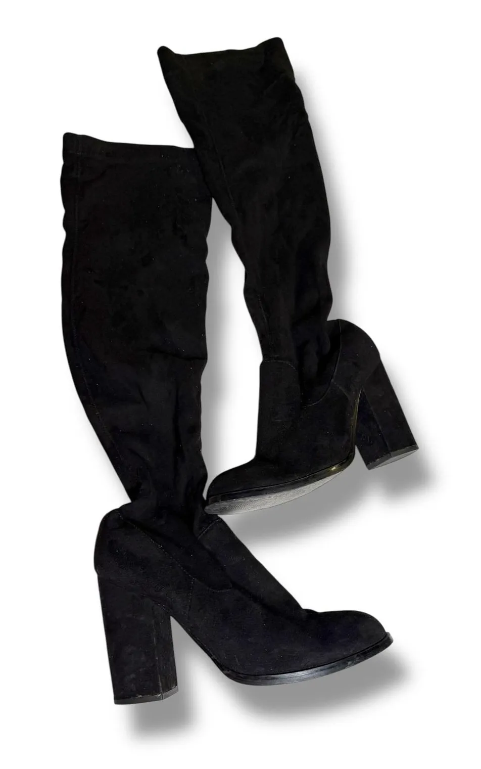 SOLSANA Boots Womens Size 38 Black Suede Block Heel Knee High Shoes Modern Chic Condition: Good – light wear to soles and heels, minor scuffs/slight lint on suede, overall gently worn Soft black suede upper with a modern block heel design Knee high shaft for a chic silhouette, perfect for day or night Leather sole branded with SOLSANA imprint Designed in Australia, made in China (per interior label) Size: 38 (fits like a US womens size 7.5-8; check brand conversion chart if unsure) Heel height approximately 3 inches (see measurement photo) Top shaft opening approximately 7 inches across (see photo for details) Classic pointed toe and easy pull-on style All brand markings shown in photos for authenticity Material composition: Suede upper, synthetic lining/sole (see care symbols on label) Ready to complete any modern, elegant or minimalist wardrobe