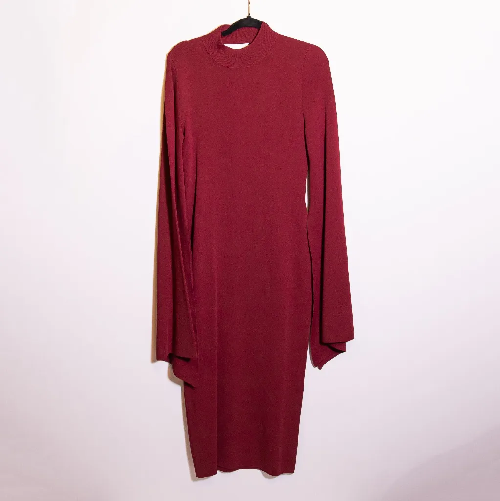 Solace London The Ami Bodycon Sweater Knit Stretch High Neck Flag Sleeve Dress 8 Pristine condition. No rips, tears, stains or discolorations. Measured Flat- Across Shoulders: 14in Underarm: 16in Sleeve Length: 32in Top To Bottom: 49in [Rondenet]