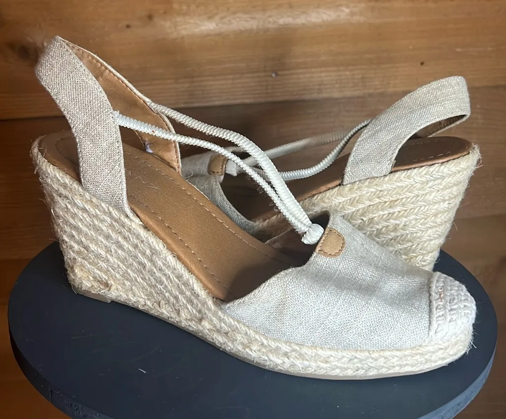 Brand: Solanz Style: Rebekah Description: Strappy slip on linen heel / espadrille. Wedge! Comfor... Show more