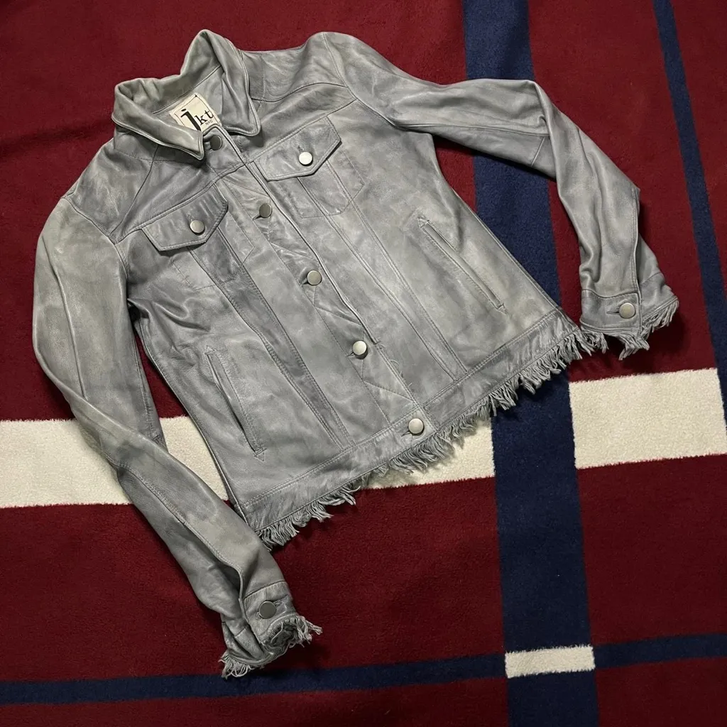 Women’s XS extra small Flat measurement Length: 22” Bust: 18” Waist: 16” Hip: 18” Sleeve: 27” Has some internal makeup wear Break all the rules with affordable luxury leather. A leather jacket with classic jean detailing featuring a frayed bottom hem and sleeves. Pair with a flowy maxi skirt and your most lived in riding boots for a look that's a little bit country and a little bit rock n' roll. Trucker jacket Classic jean detailing featuring frayed bottom hem and sleeves Wire in the collars and cuffs Two back zippers 100% Lamb Leather.