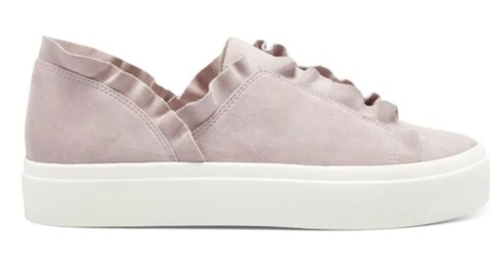 Preowned- minor wear/use No major flaws Suede leather upper with ruffle trim Color is a blush or mauve Chunky style sole Comfortable Talexa- style name keywords: preppy, girlie, feminine, platform, soft girl aesthetic, spring, casual, elevated basic, leather, pull on, slip on