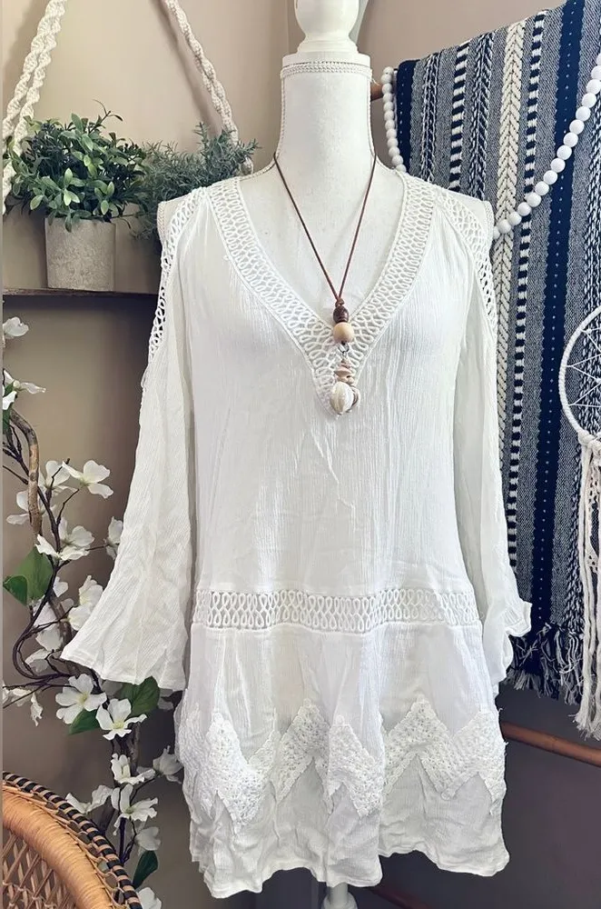 Solitaire Swim White Bohemian Cold Shoulder Swim Cover-Up/Tunic Effortlessly chic and perfect for the beach or poolside! This lightweight white cover-up features a flowy bohemian design with cold shoulder cutouts, relaxed sleeves, and a flattering tunic length. Semi-sheer fabric with delicate crochet-style accents adds a feminine touch. Ideal for throwing on over your swimsuit or styling as a breezy summer top. 🌿 **Details:** ✔️ Brand: Solitaire Swim ✔️ Color: White ✔️ Style: Bohemian Cold Shoulder Cover-Up/Tunic ✔️ Size: Large ✔️ Condition: Excellent Pre-Owned Condition Approx measurements lying flat Pit to pit 20” Length 29”