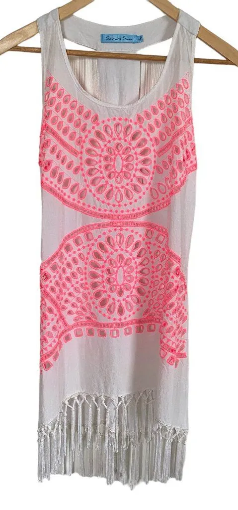 Women's Solitaire Swim pink and white swimsuit cover-up, size small. This cover-up is a racerback style, white with pink eyelets, and has a fringed hem. Smoke free pet free home! Quick shipper! Please see last picture circled in red - a small area that is folded inwards. MEASUREMENTS: 25.5" Front Length 28.5" Back Length 15.5" Pit to pit MATERIAL: Fabric: 100% Rayon Fringe: 100% Polyester Hand wash only Feel free to ask me questions
