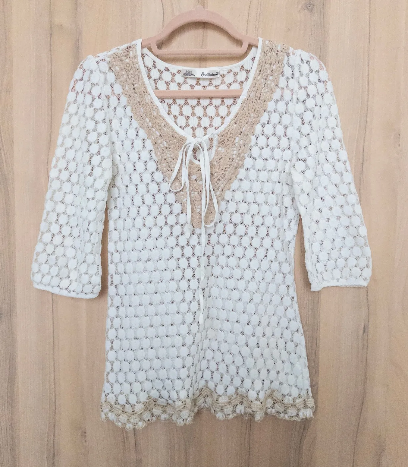 Features: * Sheer lace construction with circular dot pattern * V-neckline with tie-front detail * 3/4 length sleeves with scalloped edges * Lightweight, airy feel with delicate trim * Sheer fabric; layering recommended boho, romantic, cottagecore, feminine, retro, beach Good pre-owned condition. Light discoloration under arms. See all photos for details. Approximate measurements, flat lay: Length: 25" Pit to Pit: 16.5" (stretches to 18") Ships next business day. Bundle deals available. Smoke-free home. Please check measurements before purchasing. SKU 3821