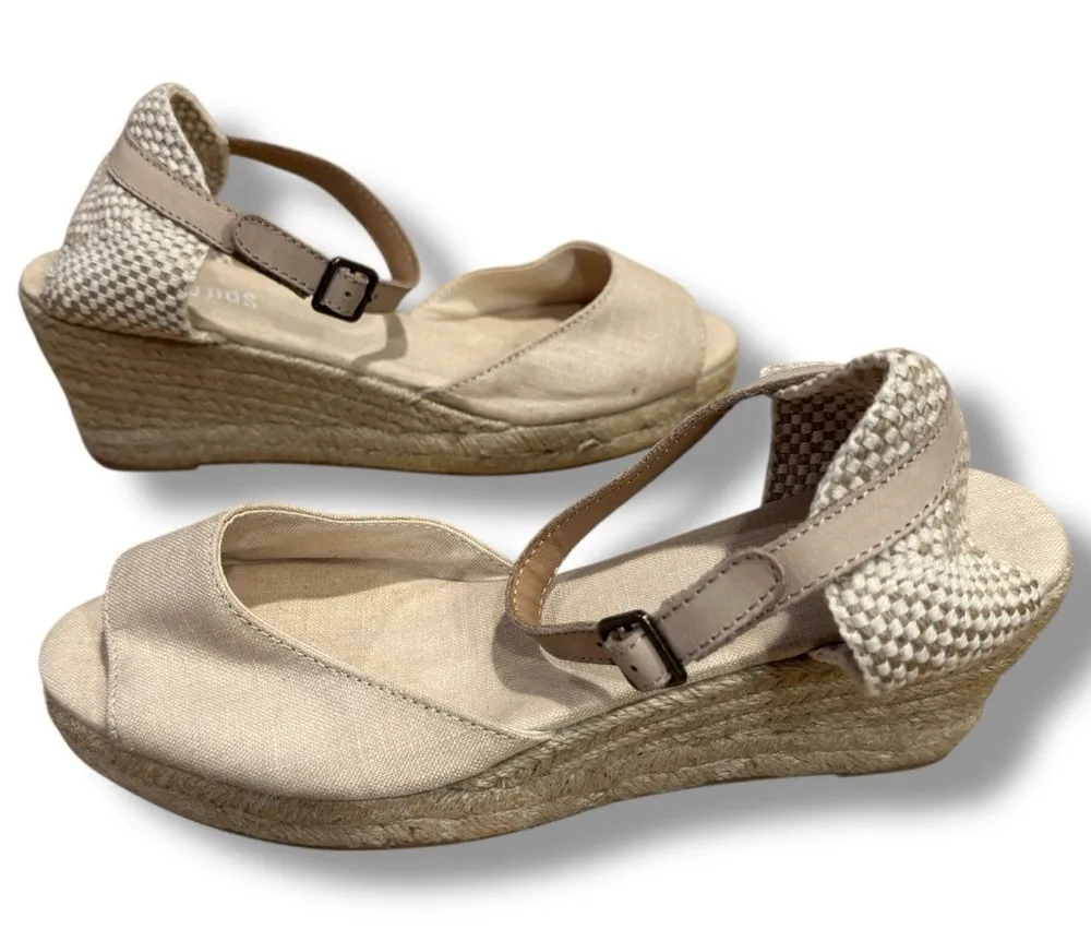 Good preowned condition, no signs of wear. Soludos peep toe espadrille wedge sandals in tan canvas. These stylish sandals feature a comfortable ankle strap with buckle closure and a woven espadrille wedge heel, offering both support and a touch of height. Perfect for a sunny day out or a casual evening gathering. Keywords: espadrille, wedge, platform, summer, vacation, casual, peep toe, ankle strap, comfortable, beach, resort, neutral, tan, woven