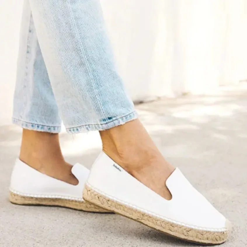 Women's white leather slip-on espadrille flats. Classic loafer silhouette with a comfortable, low-pr... Show more