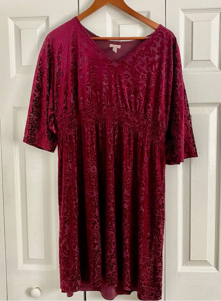 Features: V Neck A Line Relaxed Fit Midi Deep jewel tone red, wine, burgundy Devore, burnout velvet... Show more