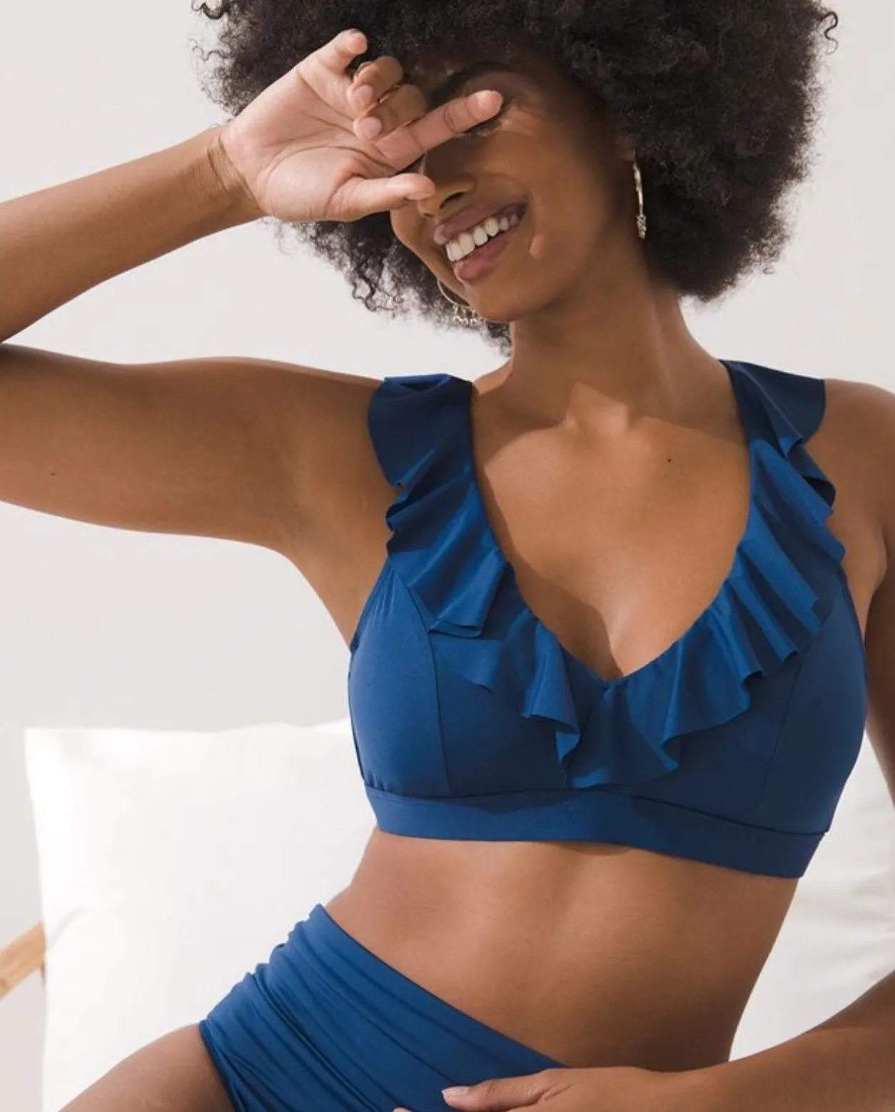 Soma Bleu Rod Beattie navy blue ruffle v-neck bikini swim top. This stylish top features delicate ruffled trim along the neckline and adjustable crisscross back straps for a secure and customizable fit. The gold tone hardware adds a touch of elegance. NWT Size 38D