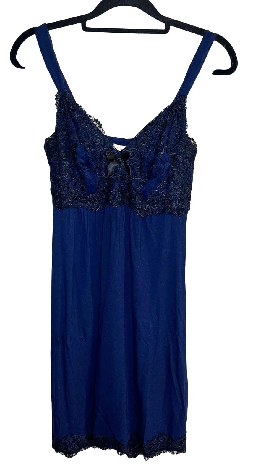 ⭐️ OFFERS WELCOME! ⭐️ 🖤 CONDITION: Good, pre-owned 🖤 SIZE: Small 🖤 MEASUREMENTS: see photos 🖤 MATERIAL: 93% rayon, 7% spandex Color: blue / black Features: adjustable straps, lace trim, embroidery, center bow detail No visible flaws. Normal/mild signs of wear.