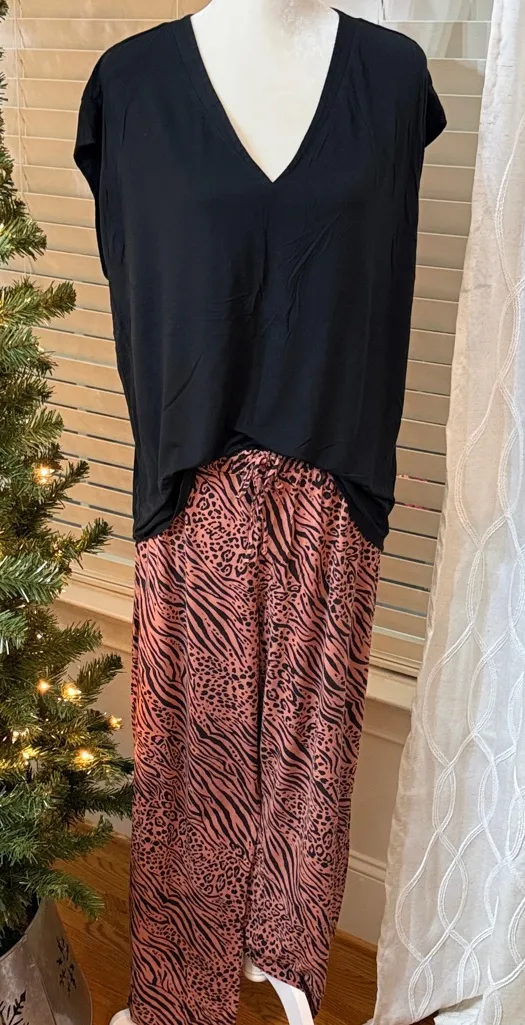 Soma Cool Nights pajama set featuring a silky-soft black V-neck short sleeve top paired with lightweight wide-leg pants in a gorgeous mixed animal print. The Cool Nights fabric is designed to stay cool to the touch and help regulate body temperature, making this set perfect for comfortable sleep and relaxing at home. The black top drapes beautifully with a relaxed fit, while the pants offer an easy pull-on style with an elastic waist, adjustable drawstring and pockets. The rust color and black animal print blends zebra and cheetah patterns for a stylish, modern look while still feeling ultra-comfortable. Both pieces are size Large and in excellent used condition. From a smoke free and pet friendly home. Excellent used condition with some natural fading and peeling. Please see photos. Open to reasonable offers. Usually ships same or next day. Style tags: cool nights, pajama set, sleepwear, wide leg pants, soft knit, animal print, loungewear
