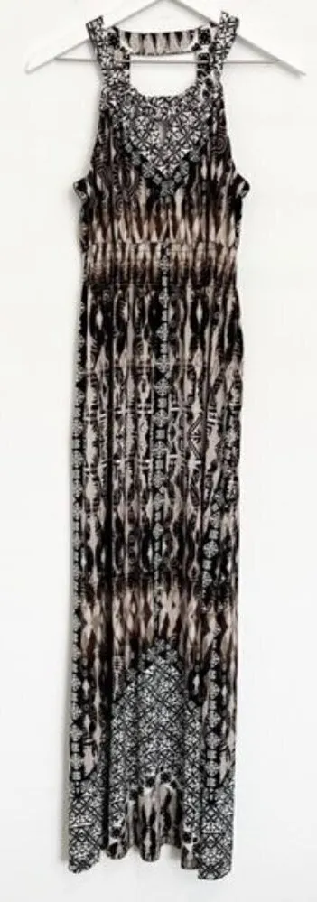 Soma Stretch Jersey Halter Keyhole Cutout Smocked Long Maxi Dress Brown Black Cut in shoulders Halter neck Keyhole cutout Smocking Maxi length Stretch jersey fabric No size tag, please see measurements below 90% Polyester, 10% Spandex Pit to Pit 17” Length 58” Measurements are approximate while flat