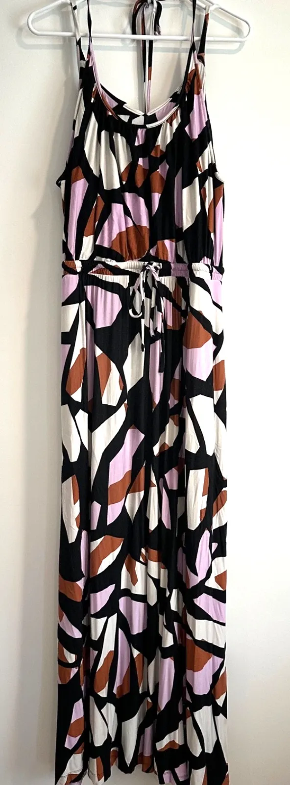 Removable Pads in the shelf bra are included Size: XL Pit to Pit: 18.5" Pit to Hem: 53" Waist (laying flat, not stretched): 17.5" Condition: Good Pre-Owned Condition, Has a moderate amount of wash wear. No Rips,Stains, or Tears.Please see all photos for most accurate representation of condition Color: Brown, Black, Purple, White Closure: Tie Pockets: Yes Material: 95% Rayon, 5% Spandex Sleeve Length: Sleeveless