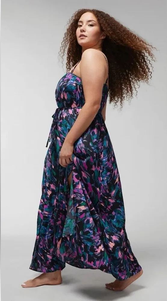 Soma Women’s Crinkle Satin Maxi Dress Size Medium Built in Bra pink teal black purple blue green bold vibrant New without tags (NWOT) tag was ripped off Pockets Built in tie belt You can remove the straps and wear it as a strapless dress Adjustable straps Built in bra no underwire Elastic around bust and straps Slit on both sides Has a satin feel Polyester Machine washable Measurements: Bust: 30 inches Length : 56 inches