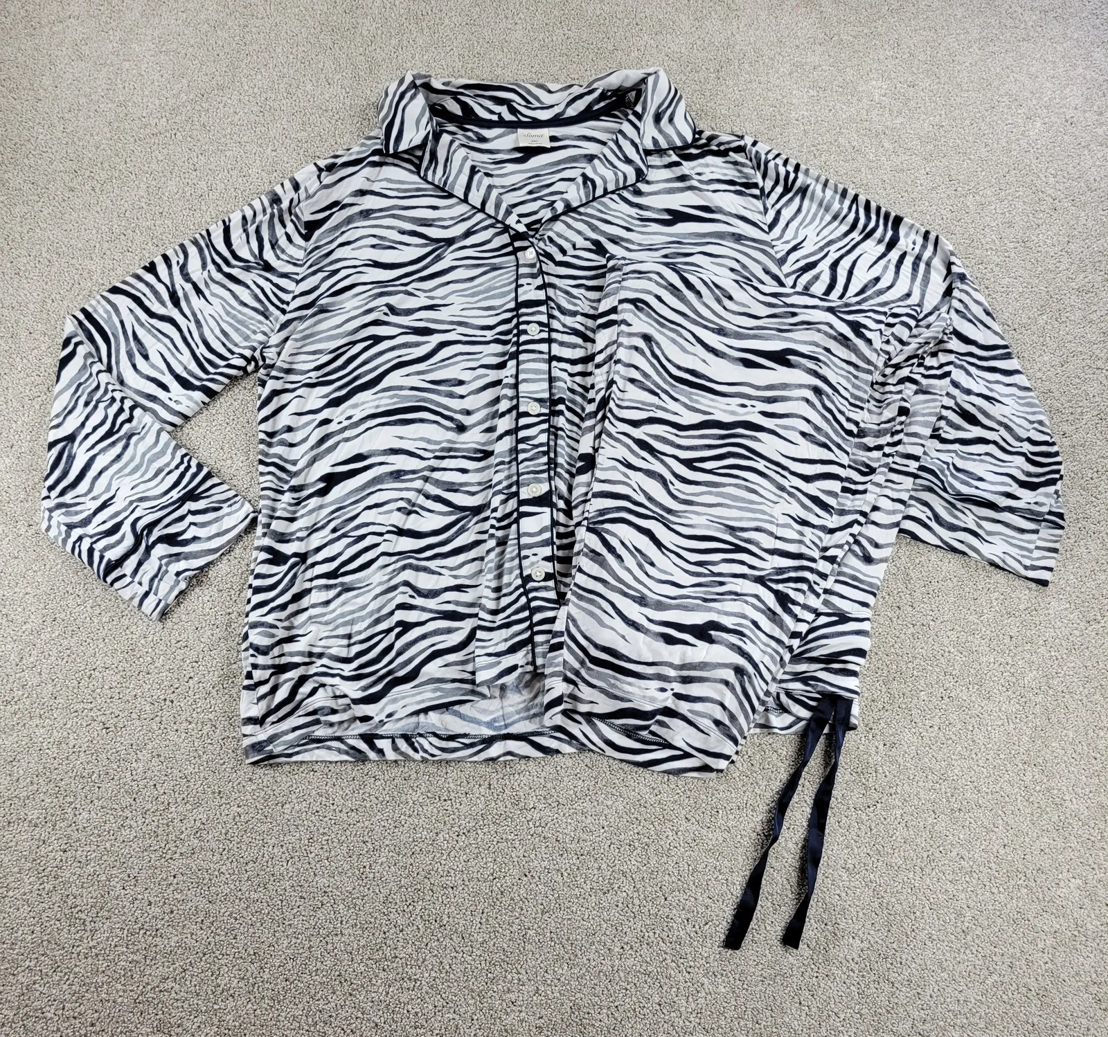 Soma Womens Pajama Set 2XL Blue White Zebra Print Long Sleeve Lounge Sleep Wear Measurements-Shirt: Pit to pit 35 inches /Length 30 inches Pants: Waist 22 inches / Inseam 30 inches / Rise 13 inches / Hem Width 9 inches Excellent Pre-Owned Condition Brand: Soma Color: White and black zebra print Size: 2XL Content / Material: Polyester, Spandex -Zebra print -Butto Front -Collared -Long Sleeve -Pull-On -Drawstring Thanks for shopping with me today! I ship on orders received by 3 pm each day. Most items are cleaned, and lovingly used, in a smoke-free environment but may show appropriate signs of wear. I do my best to make note of any irregularities with an * here in the description but feel free to inquire:)