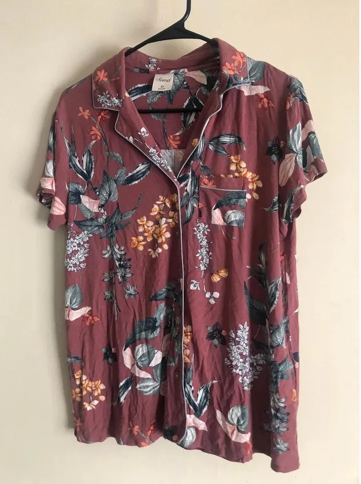SOMA Intimates Womens Pajama Top Intimate Sleep Lounge Soft Size XS COOL NIGHTS Short Sleeve Notch Collar Pajama Top Curio Floral Mulberry Rayon/Spandex Button Front 1 front chest pocket Measurements are included in the Photos Items ship within 24 hours from purchase M-F except US Holidays. 👍Reasonable offers accepted! 🚫No Trades Or Contact out of this Platform/Request to email Photos🚫
