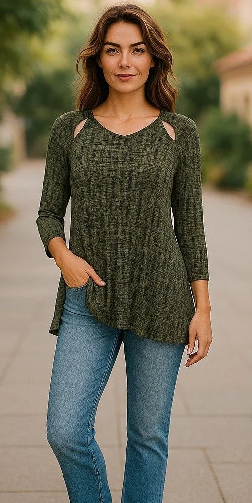 Soma Women's Top Long Sleeve Army Green Black Tunic Stretchy Knit M GENERALLY SHIP SAME OR NEXT DAY FROM FLORIDA!!! Perfect layered with black leggings and tall black boots. Rayon and Spandex material. Cut outs at shoulders and slits up the sides. Gently worn and washed - light wash wear
