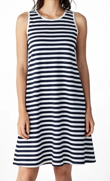 Sonnet James Sleeveless swing A-line play dress Black and white horizontal stripe Crew neck Midi knee-length Slight high low hem 92% viscose, 8% spandex — soft stretch jersey Machine wash cold, hang dry New with tags Chest: 16 1/2" Waist: 18" Front length: 34" Back length: 38" Sonnet James dress, striped swing dress, navy white stripe dress, sleeveless midi, viscose stretch dress, summer casual dress, San Francisco made, minimalist basics, mom life style dress, coastal prep
