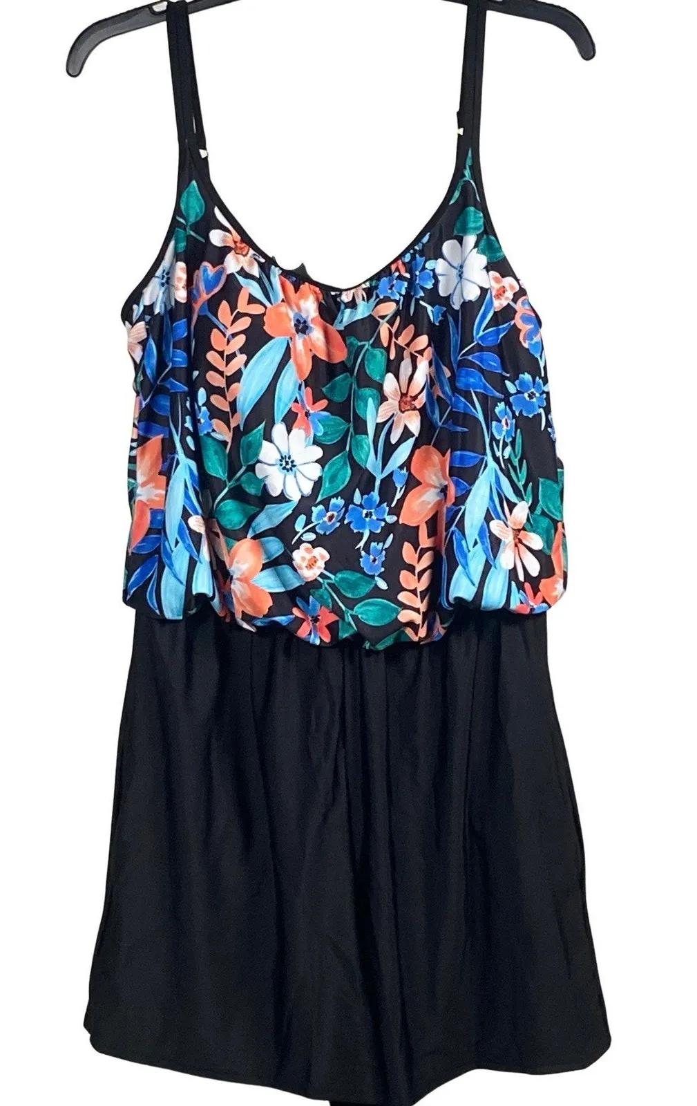 Women’s Sonnet Shores 1-Piece Swimsuit in size 14. Stylish and flattering, this swimsuit features a vibrant multicolor floral top with solid black swim shorts for a comfortable, modest fit. Designed with adjustable spaghetti straps and molded cups for support and shaping. The shorts include built-in briefs for added coverage and confidence. Made from 82/18 polyester/spandex with a 100% polyester lining. NWT $89 retail. Keywords: Sonnet Shores swimsuit, 1-piece floral swimwear, tankini-style one piece, black swim shorts, molded cup bathing suit, women’s size 14 swimsuit, modest swimwear, tummy control swimsuit, adjustable strap one piece. Waist 30" flat - elastic waist Rise 14" Inseam 3.5" PTP 18" flat Full length 33"