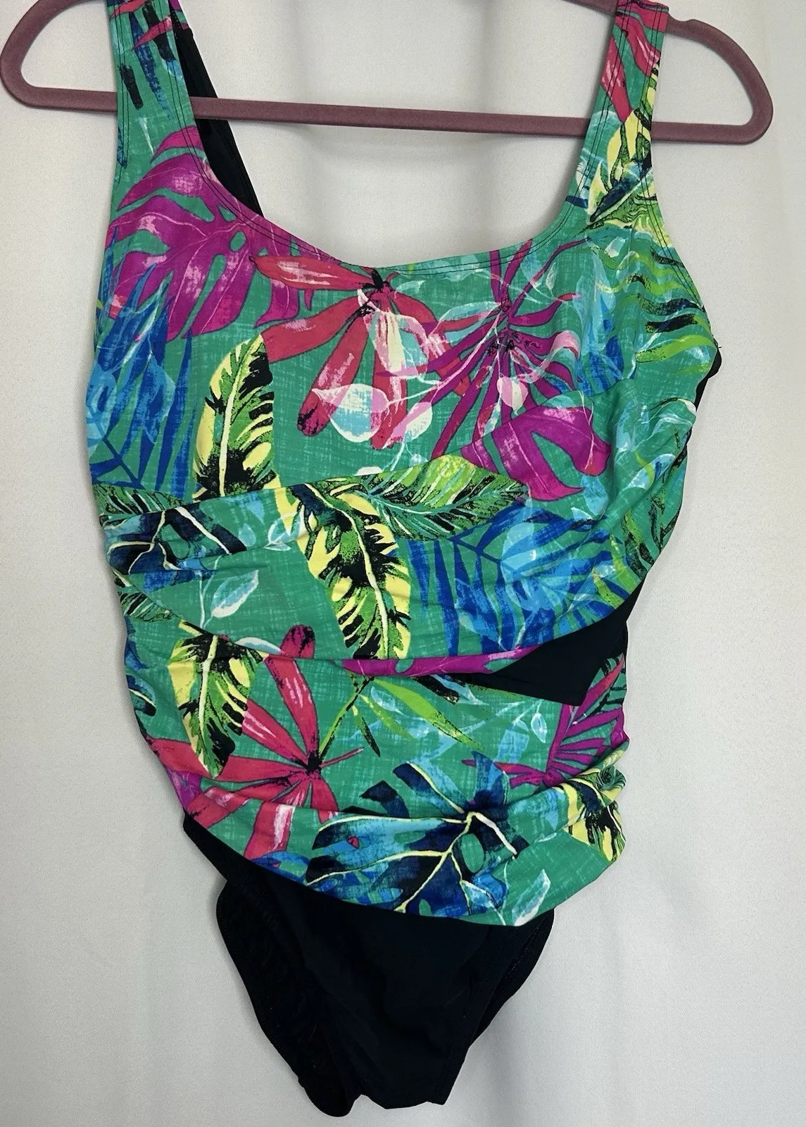 The Sonnet Shores SZ 12 Vibrant Vacation One Piece Swimsuit is a colorful and tropical-themed swimsuit perfect for beach days. This floral patterned swimsuit in multicolor is made from a blend of nylon and spandex, ensuring a comfortable fit. It features a built-in bra and is lined for added support and coverage. Hand wash only to maintain its vibrant colors and quality. Perfect for women looking for a stylish and functional one-piece swimsuit for their summer adventures. In like new condition! No piling or stretching. Bin I
