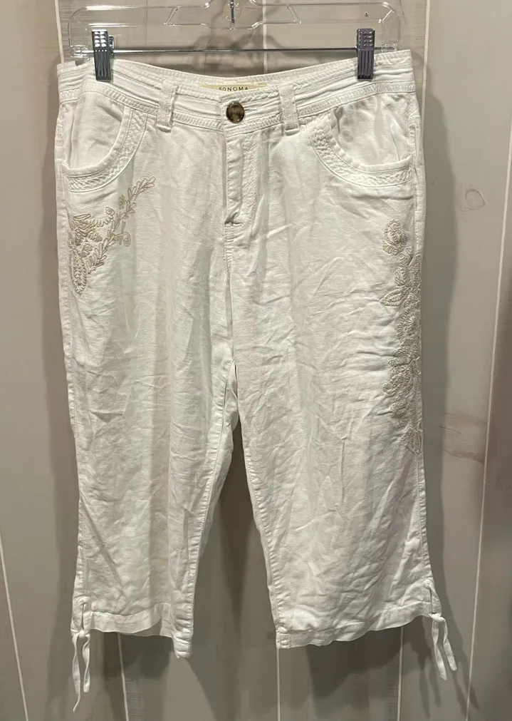 Cute creamy white embroidered Y2K crops leg ties medium rise fairy angel baby. GUC. Linen blend. Bra... Show more