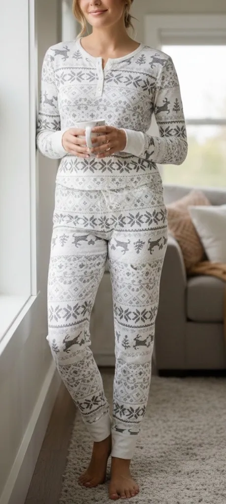 Cozy up in this stylish gray patterned sleepwear set. Perfect for a comfortable night's sleep. Features Set includes top and pants Thermal construction Top: rounded hem, 3-button front, henley neckline, long sleeves with ribbed cuffs Bottoms: slim fit, ribbed cuffs Fit and sizing Top: 24 1/4-in. length from shoulder to hem Regular: 29.25-in. inseam Long/tall (T/L): 30.25-in. inseam High rise sits below the natural waistline Skinny leg opening Elastic waistband Fabric & Care 95% polyester, 5% spandex Machine wash and tumble dry low