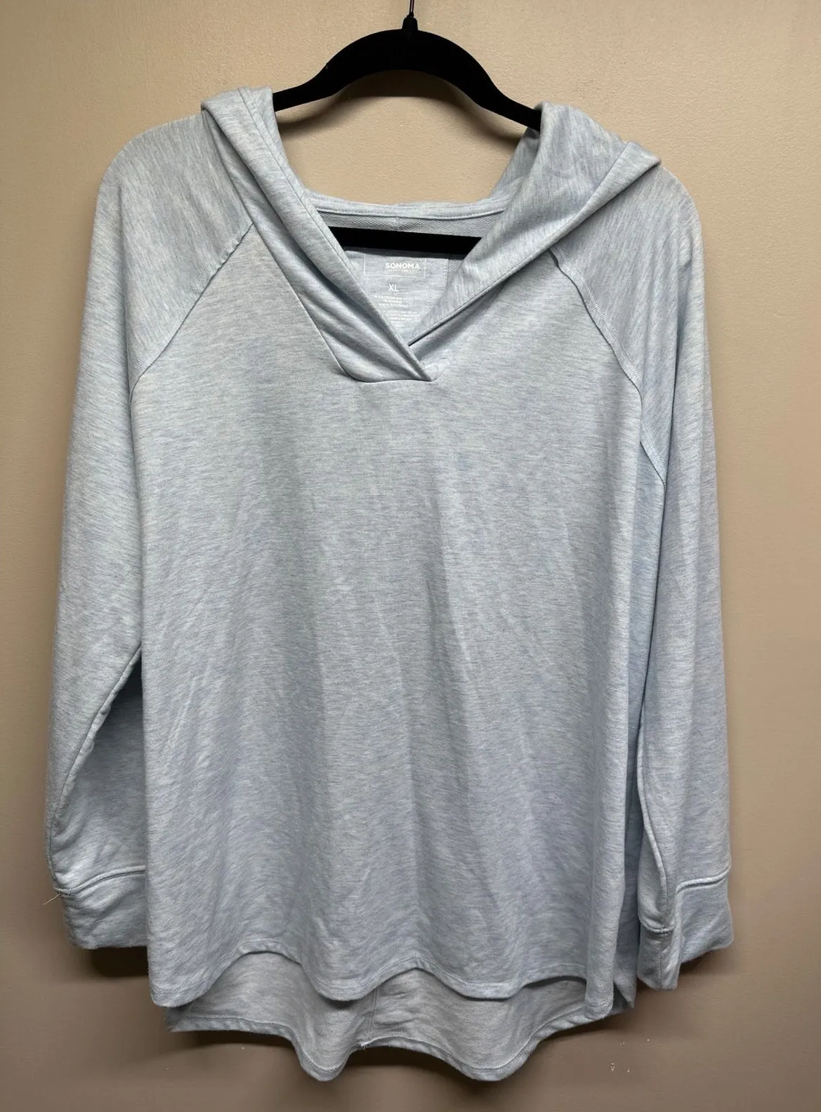 Sonoma Goods for Life heathered powder blue v-neck hoodie pullover. This comfortable top features a relaxed fit, long sleeves with cuffed hems, and a cozy hood. Its unique v-neckline with a subtle crossover detail adds a touch of style to this casual essential. Perfect for lounging at home, running errands, or a casual day out. Keywords: Sonoma Hoodie, Heathered Blue, V-Neck Pullover, Long Sleeve Top, Casual Wear, Loungewear, Comfortable, Athleisure, Everyday Style, Pullover Hoodie, Women's Apparel, XL Top, Relaxed Fit