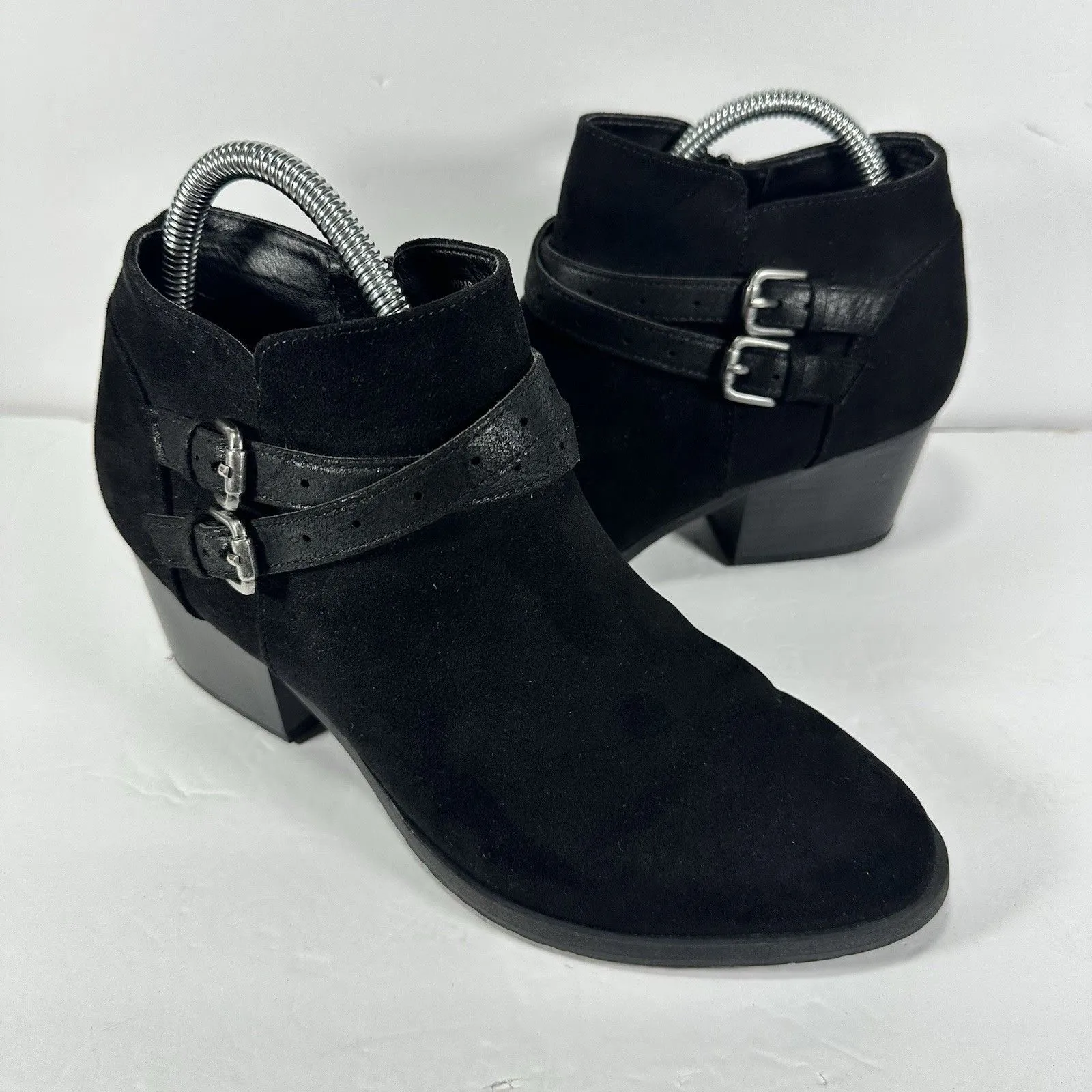 Step out in style with these versatile and edgy Sonoma Goods For Life ankle boots. The "Esme" model features a sleek black silhouette with a stylish double-buckle strap detail. Perfect for pairing with jeans, skirts, or dresses, these boots offer a blend of comfort and modern design. Item Specifics Brand: Sonoma Goods For Life Style Name: Esme Color: Black Size: Womens 8.5 Medium (M) Heel Type: Block / Stacked Heel Closure: Side Zipper for easy on/off Accent: Double side buckles with textured straps Materials: Textile upper, Man-made outsole, Textile/Leather/Man-made lining Key Features Chic Design: Features a micro-suede (textile) finish with contrasting textured wrap-around straps and metallic buckle accents. Stability: The sturdy block heel provides height without sacrificing balance or comfort. Traction: Diamond-patterned outsoles for improved grip and durability. Easy Wear: Full-length interior side zippers allow you to slip them on and off with ease. Condition Pre-owned / Very Good Condition. * Uppers are clean with minimal signs of wear. Zippers are fully functional. Outsoles and heel caps show very light wear, with plenty of life left in the tread. Please see all photos for a detailed look at the condition. Measurements (Approximate) Size: 8.5 M Heel Height: ~2 inches Pre-owned shoes sizing and fit may vary by brand or style. Sold as is. Please review photos and details before purchase. Questions welcome! Pre-owned item. May sh