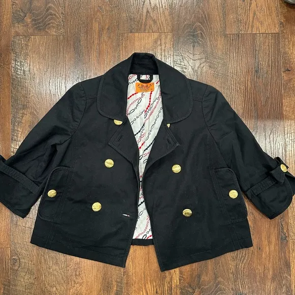 Stylish black cropped trench coat featuring gold buttons. 3/4 length sleeves with bow detail. RK7