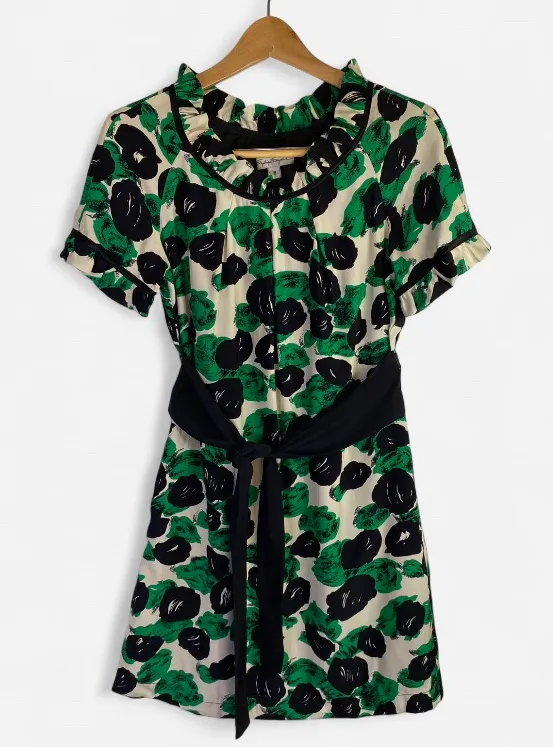 Elegant Sophia Eugene women’s dress in size 6, crafted from 100% silk with a soft lining for comfort and shape. This knee-length A-line dress features a wide black waistband that flatters the waist and adds definition. The dress has short raglan sleeves with gentle ruffles and a round neckline with a subtle ruffle detail, giving it a feminine and delicate touch. Easy to slip on over the head. Colors: white, black, and green, perfect for spring, summer, work, One sleeve has a small fabric snag (visible in photos) — it does not affect wear or style.