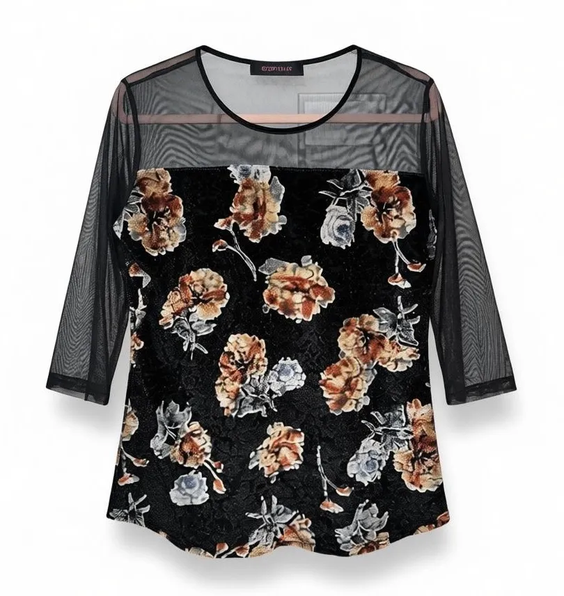 Stunning floral burnout velvet top with a sheer mesh yoke and 3/4 mesh sleeves by SOPHIA. The mix of... Show more