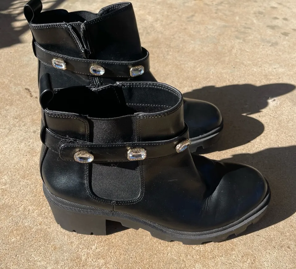 Elevate your style game with these stunning Sophia Taylor Chelsea Moto Boots. Crafted from high-quality manmade materials, these boots are designed to make a statement. With a sleek black color and unique bling detailing, these boots are perfect for anyone looking to add some pizzazz to their wardrobe. Featuring a versatile style that blends biker, combat, goth, whimsigoth, moto, and Y2k elements, these boots are sure to turn heads. The boots are available in women's size 9.5 and are ideal for anyone who wants to make a bold fashion statement. So why wait? Add these Sophia Taylor Chelsea Moto Boots to your collection today!
