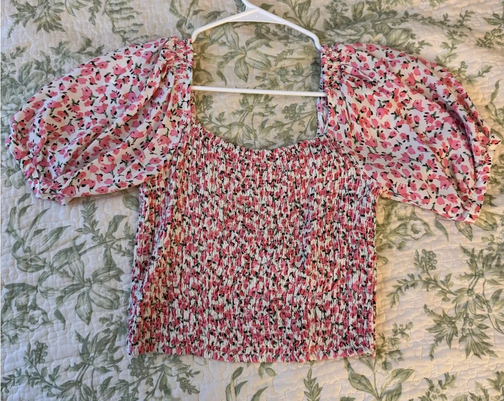 This charming blouse by Sophie Rue features elegant puff sleeves and a smocked bodice, offering a flattering fit. The red and white floral pattern adds a touch of romance, making it perfect for a stylish day out. Its puffed sleeves and smocked details create a timeless, feminine silhouette.