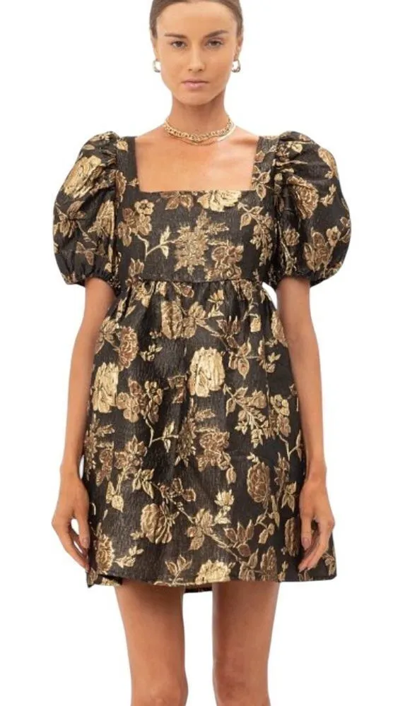 Gold jacquard metallic design, floral pattern, back tie detail, 2 side pockets puff sleeve, square neck, mini dress. New with tags Size small 16.75” pit to pit 15.5” waist 33” length 100% polyester 2330-38