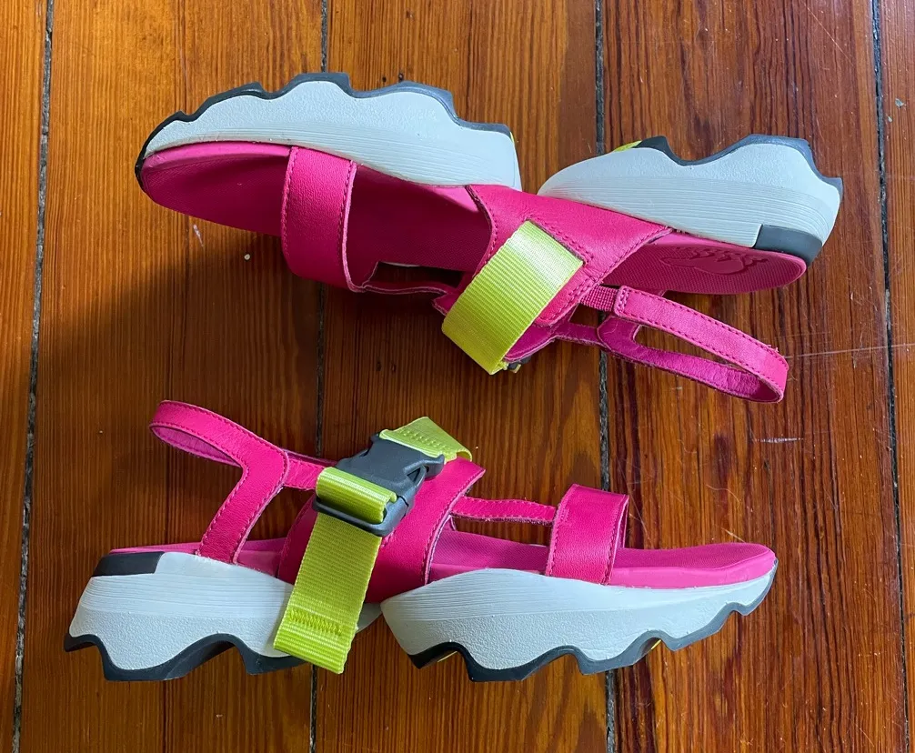 sporty chic, festival style, athleisure, chunky sole, streetwear, bold color, summer sandals, travel, Sorel sandals, kinetic impact sling, bright pink sandals, neon strap sandals, chunky sole sandals, women's size 8.5, sporty summer sandals, festival sandals, athleisure sandals, Sorel kinetic sandals
