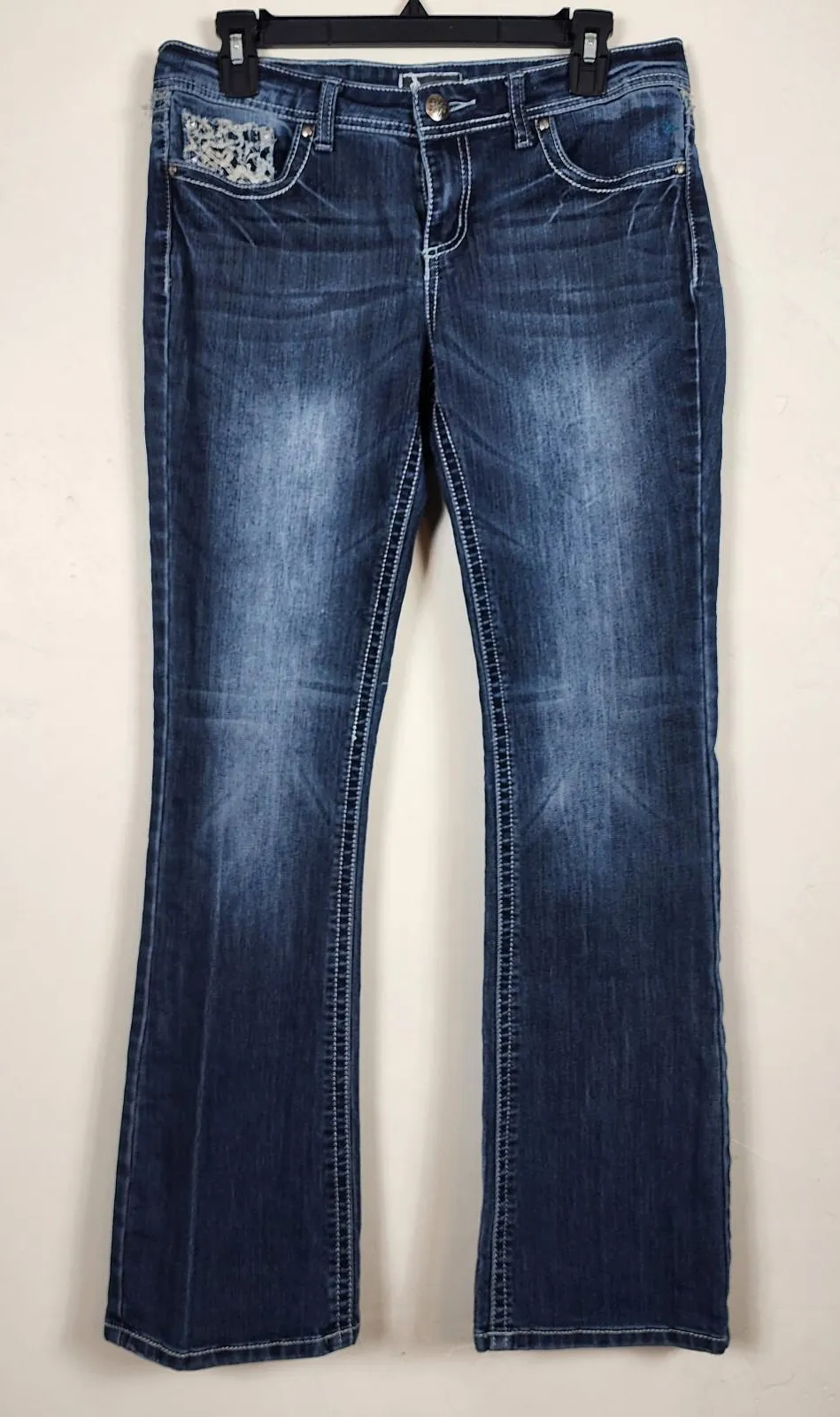 ✨ Soundgirl Ornate Embellished Stretch Denim Jeans Key Features: Style: Bootcut / Flare leg Embellishment: Features beautiful, ornate embroidery on the back pockets, accented with rhinestones/bling for a dazzling, eye-catching look. The embroidery also features details on the front pocket area (as seen in the photo). Fit & Fabric: Made with stretch denim (likely a cotton/spandex blend) for comfort, flexibility, and a great fit. Wash: Classic medium blue wash with a slight fade/whiskering, giving them a rich, versatile color. Measurements (Approximate - Laying Flat): Waist: 32 inches Inseam: 31 inches Size: Women's 11 These jeans fit well within the Y2K, Western Glam, Biker, Bohemian (Boho), and Cowgirl aesthetics. They are an excellent statement piece perfect for concerts, festivals, or a bold casual look.