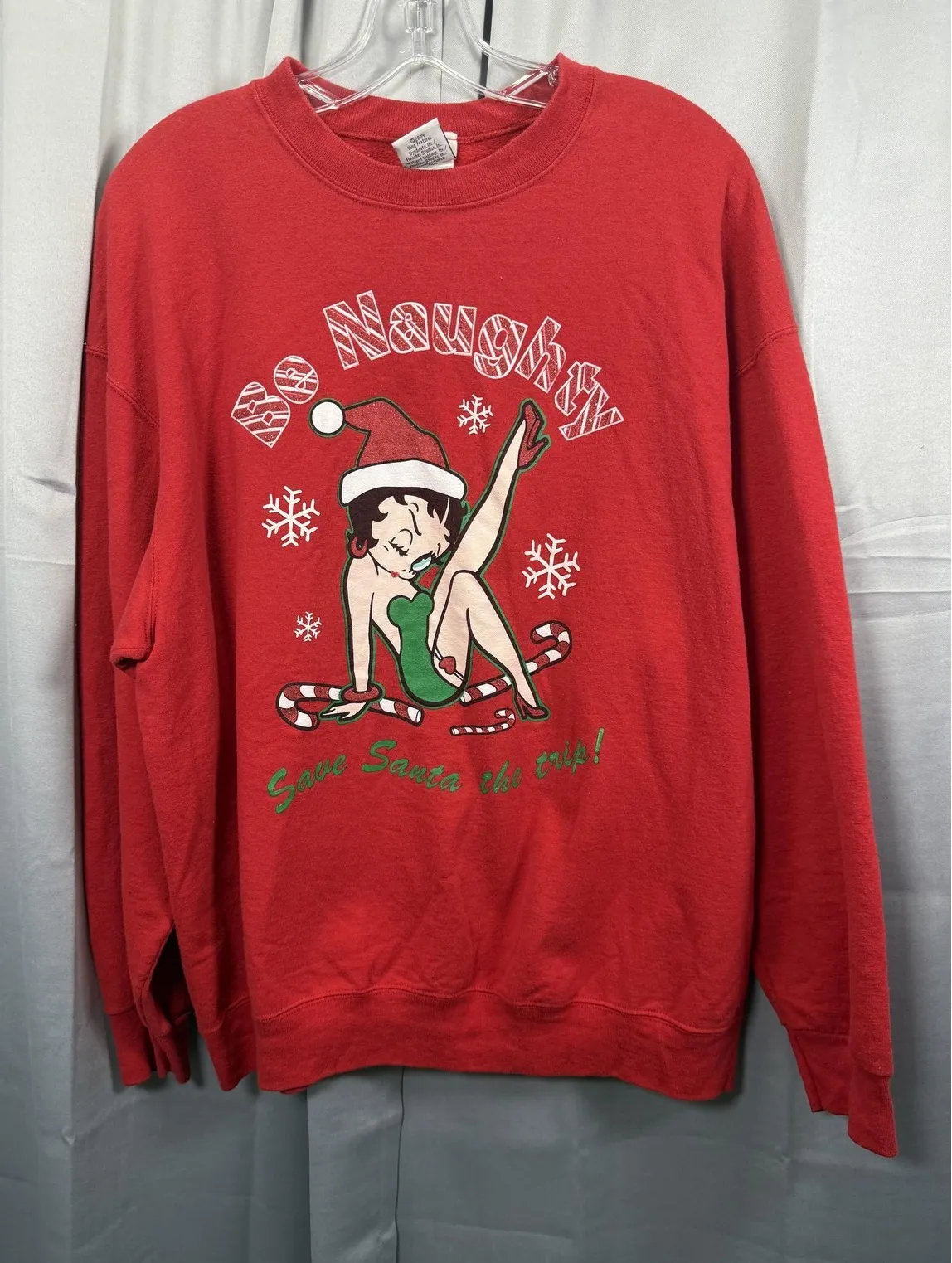 Brand/Subject: Betty Boop licensed graphic Item: Crewneck sweatshirt pullover Color: Red with white/green graphic accents Front graphic: Betty Boop in Santa hat and green dress with candy canes and snowflakes Text on front: "Be Naughty" and "Save Santa the trip!" Tag size: XL Material: 50% Cotton / 50% Polyester (fleece-backed) RN: 71868 Country of origin: Made in Honduras Style features: Long sleeves, ribbed cuffs/hem, classic crew neck, soft interior Fit note: Listed as Womens XL; casual, boxy sweatshirt fit Notes: Betty Boop heart trademark label present on tag; see photos for print details and color See pictures for measurements
